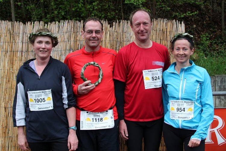 Am Sonntag dem 28. April nahmen wir wieder mit einer kleinen Mannschaft (Ute, Ulla, Markus und Michael) am Genusslauf in Müllheim teil. Trotz oder gerade wegen der kühlen Temperatur von nur 8°C am Start erreichten wir jeweils sehr gute Zeiten. Der 15. Platz von 85 Mannschaften in der Mannschaftswertung sowie der 3. Platz von Markus und der 4. Platz von Ulla in der jeweiligen Altersklasse zeigten dies. Beim anschließendem Genuss-Buffet mit einem Gläschen Sekt wurde beschlossen, auch im nächsten Jahr wieder teilzunehmen.